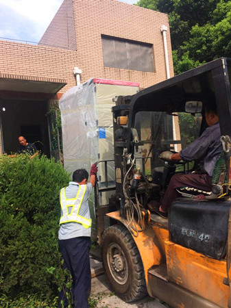 圖為工作人員正在搬運配電柜