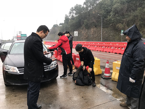 31日是春運(yùn)的前一天,下起了今年的第一場(chǎng)大雪。當(dāng)天10:30分左右,三號(hào)車(chē)道如往常一樣正常、有序,該車(chē)道正在檢查綠農(nóng)車(chē)。這時(shí)一輛牌照為浙JVIT6*黑色小轎車(chē)緩緩駛?cè)耄蝗辉撥?chē)加速調(diào)整方向,想朝二號(hào)車(chē)道沖去。與此同時(shí)從它后方快速?zèng)_出一輛轎車(chē)檔在了該車(chē)前面,接著后方又沖出一輛黑色轎車(chē),攔截在該車(chē)后方的去路。兩輛車(chē)上跳下幾個(gè)大漢,以迅雷不及掩耳之勢(shì),一擁而上干脆利落的將車(chē)內(nèi)三名犯罪嫌疑人控制。 當(dāng)班收費(fèi)員被這一幕驚呆了,不過(guò)迅速反應(yīng)過(guò)來(lái),啟動(dòng)應(yīng)急預(yù)案,呼叫監(jiān)控員,監(jiān)控員在監(jiān)控視頻中發(fā)現(xiàn)這個(gè)情況后,第一時(shí)間通知所長(zhǎng)。所長(zhǎng)孫明偉得知情況后立即趕赴現(xiàn)場(chǎng),確認(rèn)核實(shí)身份,并令當(dāng)班班長(zhǎng)第一時(shí)間聯(lián)系當(dāng)?shù)嘏沙鏊藢?shí)身份。在得到明確的答復(fù)后,工作人員立刻封閉該車(chē)道,為民警辦案提供方便,并打開(kāi)備用車(chē)道正常收費(fèi)疏導(dǎo)過(guò)往車(chē)輛,組織人員疏散圍觀群眾避免車(chē)輛和人員停留過(guò)多影響民警辦案。