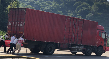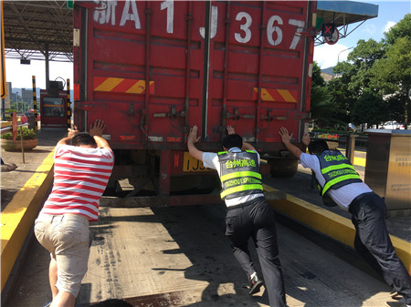 6月19日15時左右,一輛杭州牌照的大貨車,在進入臨海南收費所三車道時突然熄火拋錨,司機嘗試了幾次無法啟動,立刻下車檢查車況。 “師傅,怎么了?有什么能幫您?”收費員徐海源見此情景,立即上前熱心詢問。 “哎!包在油箱口的塑料紙怎么就掉進油箱內(nèi),現(xiàn)在車子怎么都發(fā)不動不了。”司機有點發(fā)急地回答。 “師傅,別著急,我先找?guī)讉€同事幫您把車推出車道。”收費員趕緊安慰司機焦急心情。 “好的,那謝謝你們。”司機連忙點著頭。為了避免車道堵車,徐海源立刻利用對講機向當(dāng)班班長周萍說明情況,周萍立刻關(guān)閉該車道,啟動備用車道。此時此刻,收費員李俊杰、楊旭佳毫不猶豫的趕了過來與駕駛員一起推動車子。“一、二、三,一、二、三,使勁呀……”可是車子仍然紋絲不動。怎么辦?請求支援!正準(zhǔn)備下班的行政人員陳瑩、劉華萍得知情況后,二話不說飛奔到車道,加入到推車行列中。用力推呀——哎,不行;再來一次——還不行。面對23.97噸的大貨車,大家仍是束手無策。“去找根鐵棒試試!有道是給你一根鐵棒,我能翹起整個地球。”不知是誰大喊了一聲。“行,可以試試,快去找”話音剛落李俊杰快步跑向所內(nèi),尋找鐵棒。不一會兒,只見他興奮地高舉鐵棒沖著大家喊道:“找到了!找到了!”