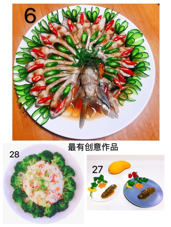 圖為評委團評選 本次活動共32幅作品進行參評,最終評選出朱英英的《鳳尾蝦球》、謝海云的《饞嘴螺絲》、李菊麗的《昂翔展翅》、陳瑩的《骨色骨香》為“最佳作品”,朱英英的《孔雀開屏》、葉懿慧的《向陽花》、吳琴琴的《秋收》為“最有創意作品”。大家紛紛相約疫情過后,以廚會友、以食為樂,來一場百家宴一飽口福。 陳瑩