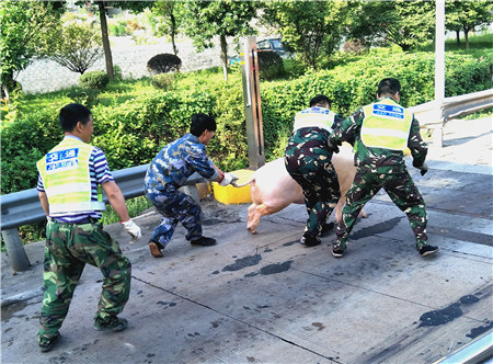 面對突發(fā)的緊急情況,駕駛員一時束手無策,當班副班長立即向值班領(lǐng)導匯報,請求增援。為了防止這頭豬給過往車輛造成安全通行威脅,收費所工作人員及時關(guān)閉了7號車道,此時的“二師兄”不讓人靠近,大家只好形成一個包圍圈,不讓它竄到其他車道去。幾分鐘后,增援的高速執(zhí)勤隊員趕到現(xiàn)場,大家七手八腳,終于將這頭豬扛著,送回到了小貨車上。執(zhí)勤隊員說,這輛車上的一頭豬剛剛還在黃土嶺隧道內(nèi)跳出來一次。