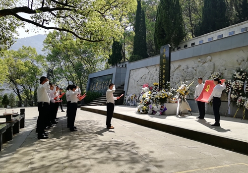 圖為敬獻(xiàn)鮮花 九峰烈士陵園始建于1956年,埋葬著20世紀(jì)50年代為國(guó)捐軀的120余位革命先烈。墓區(qū)內(nèi)青松翠柏環(huán)繞,墓前豎有一座“革命烈士永垂不朽”的石碑。上午10時(shí)許,祭掃儀式開(kāi)始,全體人員懷著無(wú)比崇敬的心情向革命先烈鞠躬默哀,緊接著依次走到紀(jì)念碑前敬獻(xiàn)鮮花,表達(dá)對(duì)革命先驅(qū)的悼念與緬懷之情。在紀(jì)念碑前,全體黨員重溫入黨誓詞“我志愿加入中國(guó)共產(chǎn)黨,擁護(hù)黨的綱領(lǐng),遵守黨的章程......”