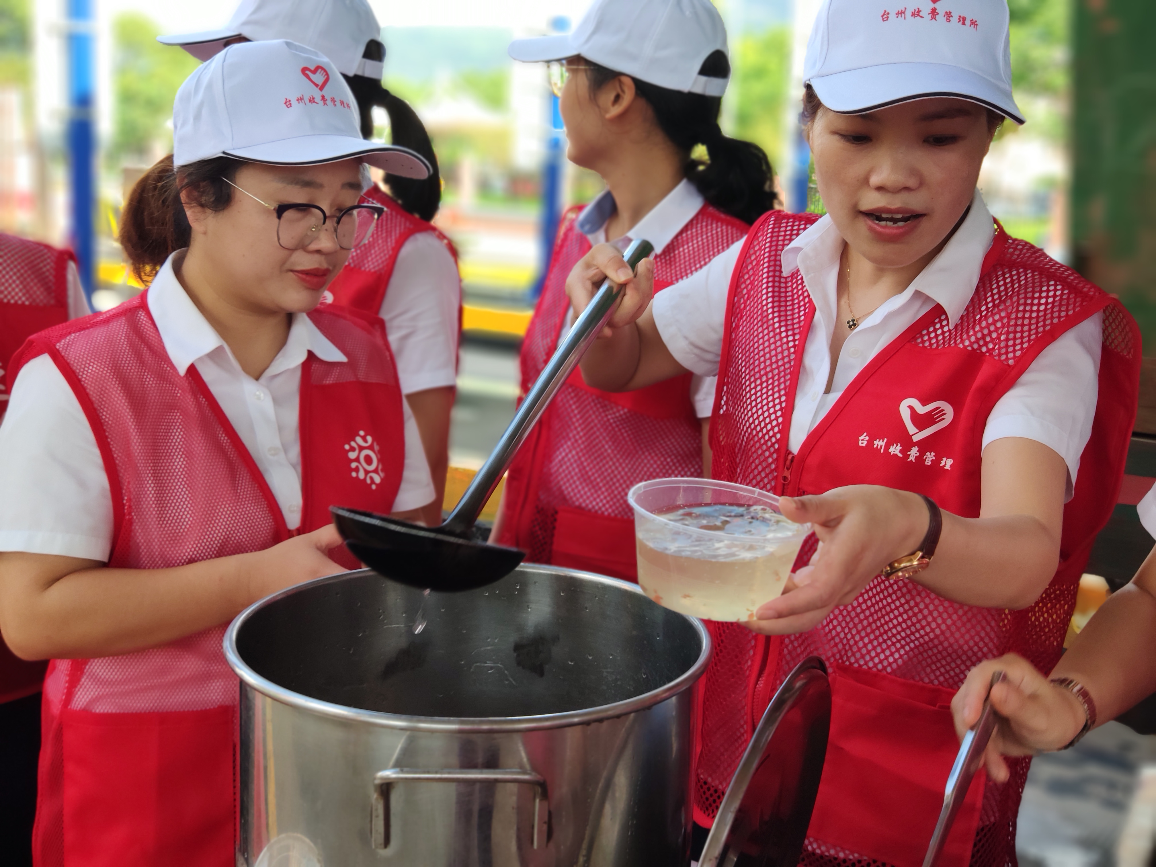 圖為志愿者合影 上午9點(diǎn),志愿者們身著統(tǒng)一紅馬甲,在崗?fù)さ陌踩珝u上設(shè)立服務(wù)臺(tái),抬出食堂提前制作好的青草糊、綠豆湯等清涼飲品。你來分杯我來送,大家不亦樂乎開始了送清涼活動(dòng)。