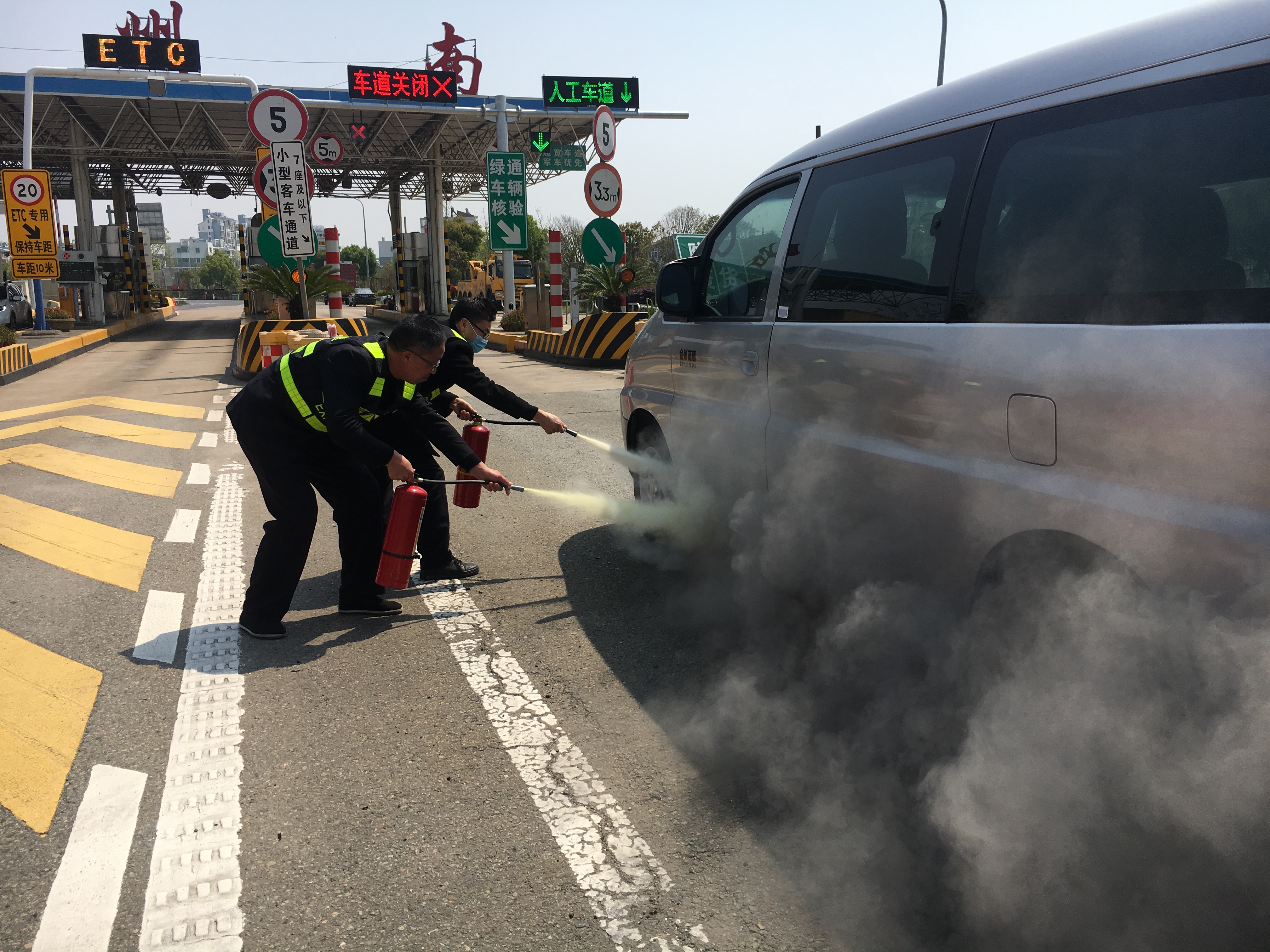 圖為交通事故應急演練 在收費廣場交通事故應急預案演練中,該所模擬了汽車在收費車道起火的交通事故。事故發生后,當班班長第一時間啟動預案,將險情報告監控員,并立即關閉事故車道,組織人員對起火點進行前期壓制,同時指揮人員擺放標志,引導后續車輛,并快速放行。接到險情報告的所長、辦公室人員迅速趕到現場參與救援:女同志協助班組開足車道;部分男同志負責出入口車輛的疏導指揮工作;其余人員負責對火災進行撲滅……大家各司其職,快速處理險情。