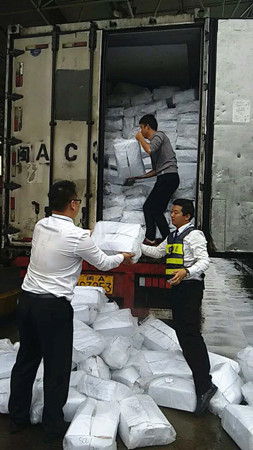 圖為工作人員幫忙搬運掉落的貨物 這輛滿載海鮮的綠農(nóng)車,貨物掉滿車道,司機一人束手無策,當(dāng)班班長陳豐平在拍完綠農(nóng)照片后,叫上班員林葉輝,一起快速幫助司機一件一件地傳遞貨物。盡管每一袋貨物都十分重,但是他們?yōu)榱藥椭鷰煾堤嵩缯碡浳铮櫜坏媚樕辖豢椀暮顾陀晁?/span> 由于工作人員的幫助,司機離開時一直道謝。他們對司乘人員的主動援助,使得溫嶺西收費所的服務(wù)不單單停留在窗口問候上,還將延伸服務(wù)一直呈現(xiàn)。 陳豐平
