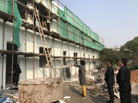 圖為檢查人員檢查新辦公大樓施工