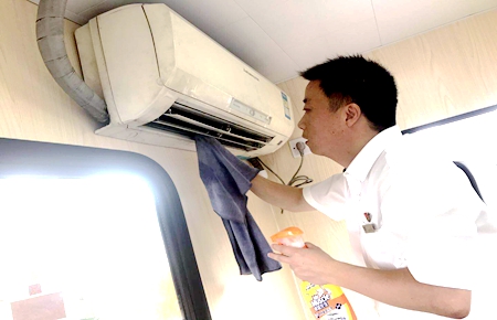 圖為黨員杜佳清洗空調(diào)