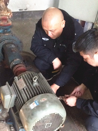 圖為工作人員修理水泵電機現場 因設備比較陳舊,而且原圖紙等資料不全,構造原理無從了解,黃土嶺隧道所所長助理金衛軍帶領執勤隊,一邊推測,一邊根據水泵工作原理和電器修理經驗尋找故障點,對設備可能出現的問題進行反復推敲,逐一排查,最終確定為上水位控制繼電器觸點接觸不良造成導電故障。經過對觸點的調整和修復,以及對軸承部位進行加油和電機、水泵平衡重新調節后,設備之前出現的電機震動、聲音異常現象和無法自動進水等問題被一一解決,消防水泵恢復正常運作。 此次檢修工作不僅及時消除了安全隱患,確保設備隨時處于良好的待命狀態,在檢修的過程中,也為隊員開展了一次良好的技術培訓。 毛譯聆