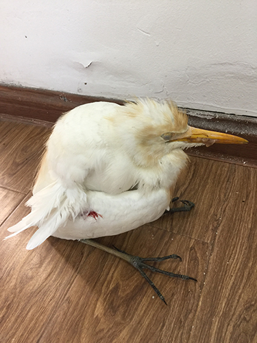 圖為受傷的牛背鷺 走近細看,這只鳥耷拉著腦袋,有著圓滾滾的小身子,尖尖的嘴巴和細長的腿,不同于平常所見的鳥類,其左側(cè)翅膀還有紅紅的血印子,估計是被人射獵受傷。 后經(jīng)百度查詢,臺州市林業(yè)專業(yè)人員鑒定確認,此鳥為省級保護鳥類牛背鷺。專業(yè)人員欣慰地說,幸好隧道所人員及時救助,否則這只鳥鷹會有生命危險。它的翅膀受傷嚴重,這是奮力飛行一段時間后因受傷而掉落,已經(jīng)沒有了捕殺能力。