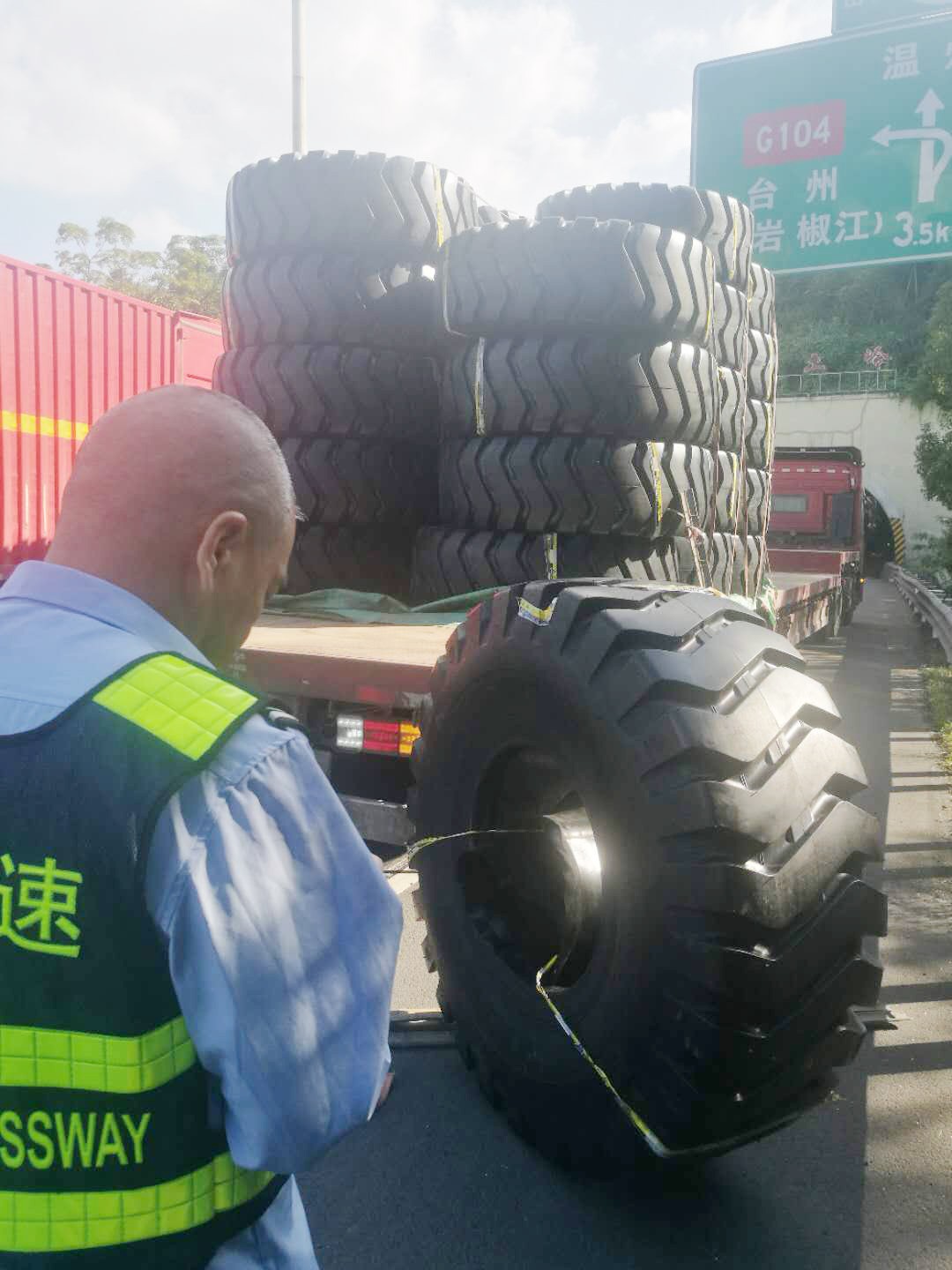執(zhí)勤隊(duì)接警后立即趕往事故地點(diǎn),一輛運(yùn)載輪胎的貨車停靠在主車道,其中一個(gè)巨型輪胎滑落到硬路肩上,致使后方車輛紛紛避讓。為及時(shí)消除險(xiǎn)情,執(zhí)勤隊(duì)快速在現(xiàn)場(chǎng)做好安全警戒工作,同時(shí)將現(xiàn)場(chǎng)情況反饋給監(jiān)控中心。由于貨車綁繩索松動(dòng),重達(dá)300多斤的輪胎脫落在地,隨后執(zhí)勤隊(duì)協(xié)同施救中心、駕駛?cè)?/span>員合力將掉落的輪胎先拖至車旁,經(jīng)過長(zhǎng)達(dá)半個(gè)小時(shí)的搶險(xiǎn),跌落的貨物終于完好無缺地回到貨車上,道路恢復(fù)暢通。 筆者溫馨提醒:在高速公路行駛過程中,駕駛?cè)藨?yīng)注意將車上的貨物固定好,途中要隨時(shí)注意貨物及捆綁繩索是否松動(dòng)。無論是車輛撒落物還是人為拋灑物,都會(huì)給道路安全暢通埋下了重大隱患! 林玲