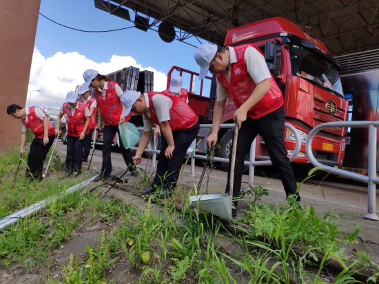 圖為志愿者清理收費(fèi)所內(nèi)外廣場(chǎng)的垃圾