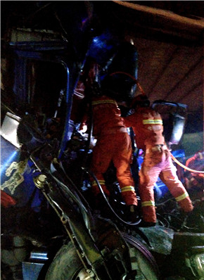 5分鐘后,兩輛紅藍(lán)警燈閃爍的施救車迅速飛至現(xiàn)場。此時現(xiàn)場多車損毀嚴(yán)重,尤其最后一輛大貨車駕駛室嚴(yán)重變形,司機(jī)受傷,胸部以下被車頭卡住無法動彈,血水從門縫流出,現(xiàn)有設(shè)備無法有效救援,也無法知道有無生命危險。