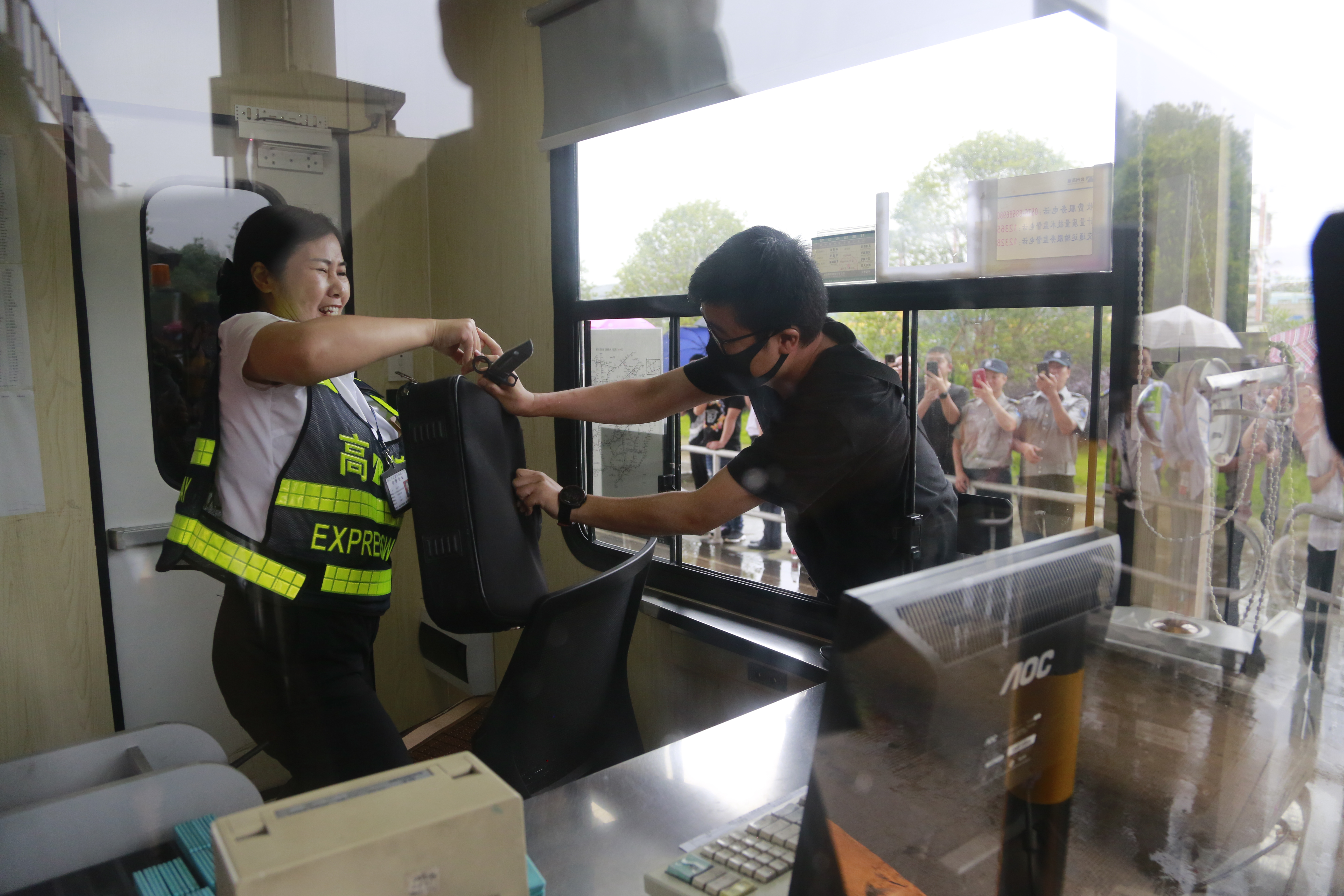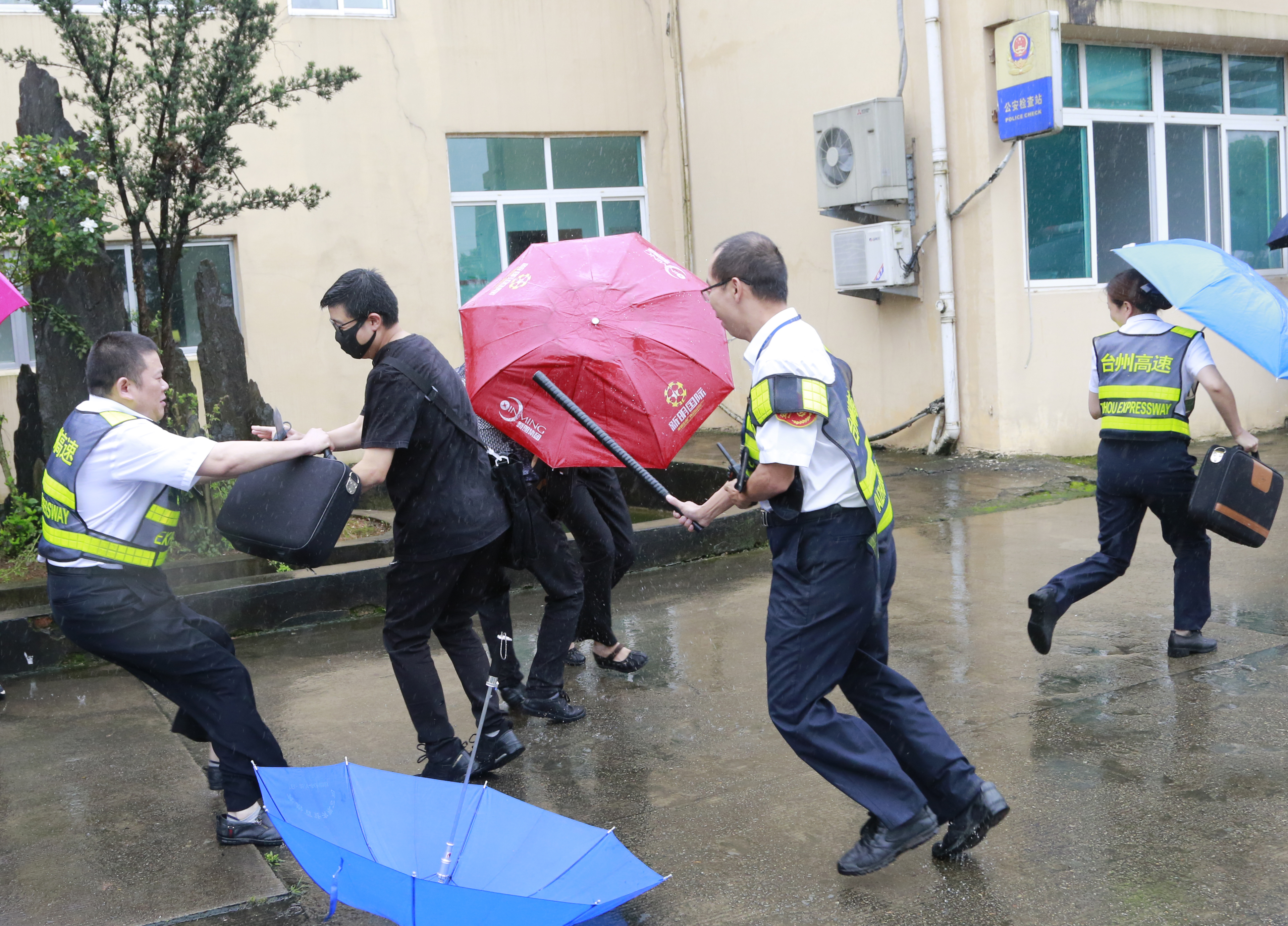 圖為演練現場 隨后,多名參演員工冒雨模擬收費崗亭和列隊下崗遭遇“歹徒”搶劫的情景開展防盜搶演練。現場,2名蒙面歹徒執仿真刀、軟棍威脅收費員交出現金,危機之中,收費站立即啟動應急處置預案并報警求助,收費員有效與歹徒周旋,應急處置組人員迅速攜鋼叉、橡膠棒、勞動工具等赴現場支援,值班領導、收費班長、監控員合力協作應對歹徒,防盜搶演練順利結束。