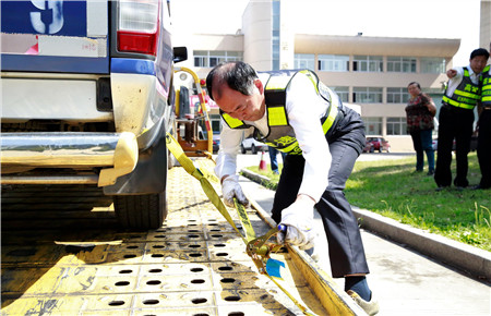 當哨聲響起時,清障作業的考試開始了。就象聽到路上事故的指令,選手們飛快躍上清障車,趕到“現場”,一組兩名員工,一名快速擺放隔離筒進行預警,一名趕到“事故車”前進行背拖拖曳作業,綁帶作業、固定輪胎,甚至警燈、檔位、手剎、安全帶、巡視事故車等細節也有具體要求,雖然上午天氣涼爽,可因為比賽的速度比拼與現場緊張的氣氛,選手們額頭都冒出了熱氣。