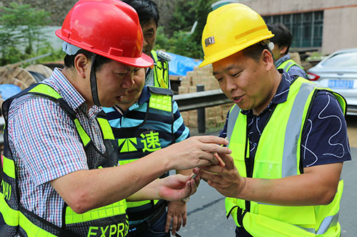 圖為集團總工程師江輝為交通疏導員送上慰問品 大溪嶺隧道溫向隧洞中,施工人員正在拆除原設備,除了噪音和洞中彌漫的灰塵,高溫高濕的環境也嚴重考驗著施工人員的身心。江輝提著慰問品,向隧洞中和烈日下正在崗位上工作的施工人員和交通疏導員送上慰問品。考慮到一線人員的特殊情況,江輝特別要求采購人員將送清涼物資改為八寶粥、蛋黃派、飲料等可以直接食用的物資,方便施工人員可以隨時補充能量。