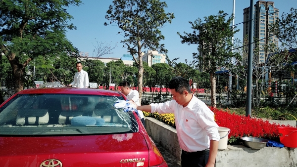 溫嶺西支部書記周超帶領(lǐng)黨員服務(wù)群眾 當(dāng)天上午,活動一開始,前來洗車的車輛絡(luò)繹不絕。在支部書記周超的帶領(lǐng)下,五名黨員便開始分工合作。兩名男同志負(fù)責(zé)沖水、上泡沫、擦洗、再沖水,兩名女同志負(fù)責(zé)擦干和吸塵器清掃內(nèi)室,還有一名男同志負(fù)責(zé)開車挪車,需要清洗的車輛一輛接著一輛,黨員同志們顧不得擦干身上的被水濺濕了的衣服,忙得不亦樂乎。看著被洗得一塵不染的車,大家都不約而同地會心一笑。