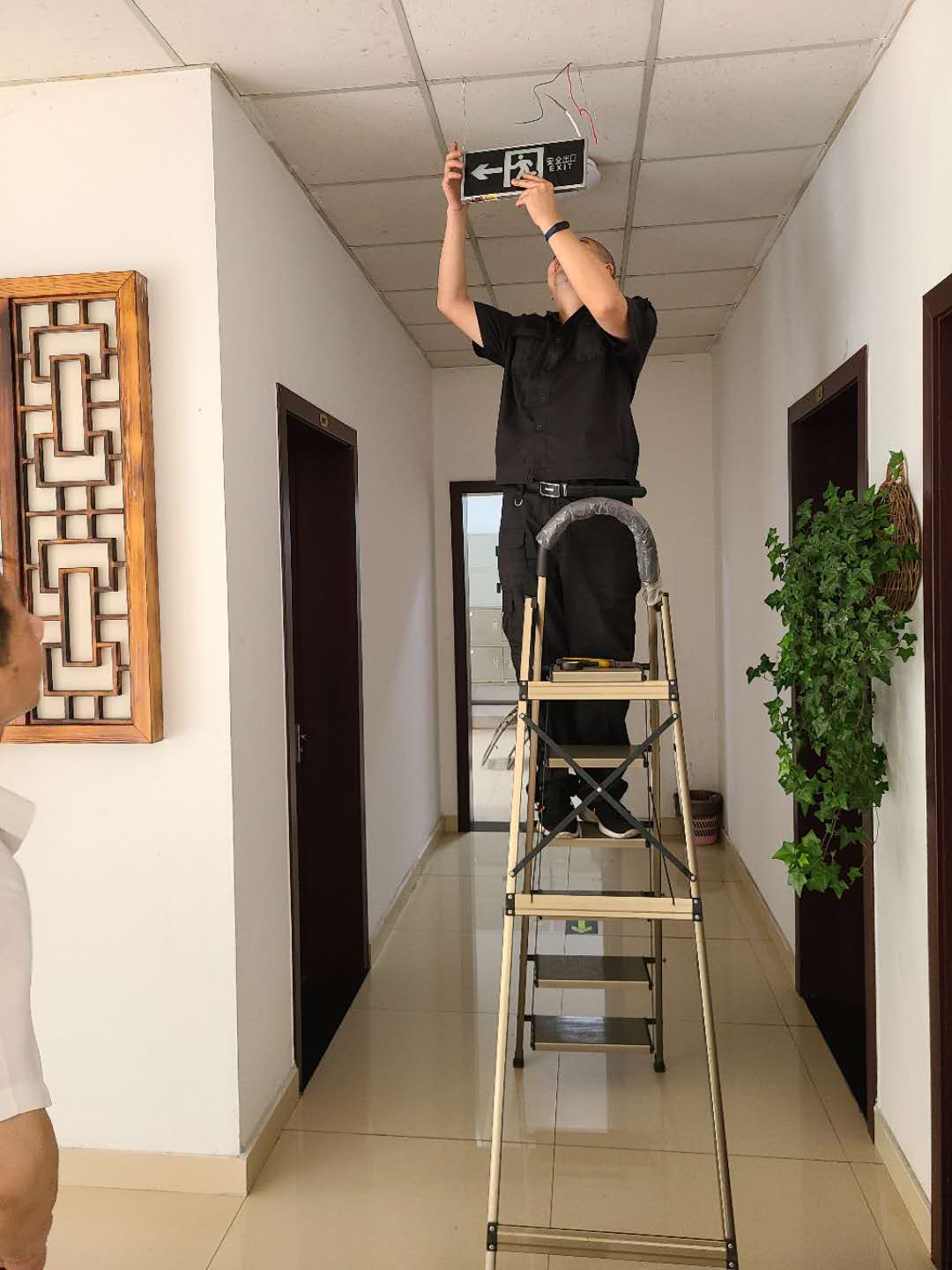 圖為技術(shù)人員安裝現(xiàn)場(chǎng) 在得知這一情況后,維養(yǎng)中心積極協(xié)助收費(fèi)站所購(gòu)買相關(guān)的主材及配件,并主動(dòng)承擔(dān)了這些設(shè)備安裝工作。由于設(shè)備安裝位置很多沒有直接可用電源,中心技術(shù)員們就從四五米外甚至更遠(yuǎn)的地方,一路套管放線過來取電,并用電錘等工具為其開孔固定,最后再完成接線送電。經(jīng)過2天努力,這些帶有方向提示標(biāo)識(shí)、安全出口標(biāo)識(shí)的燈牌被安裝在各層樓梯出口、拐角或主要通道上,因全部帶有儲(chǔ)電功能,即便在斷電的情況下也能發(fā)光發(fā)亮。