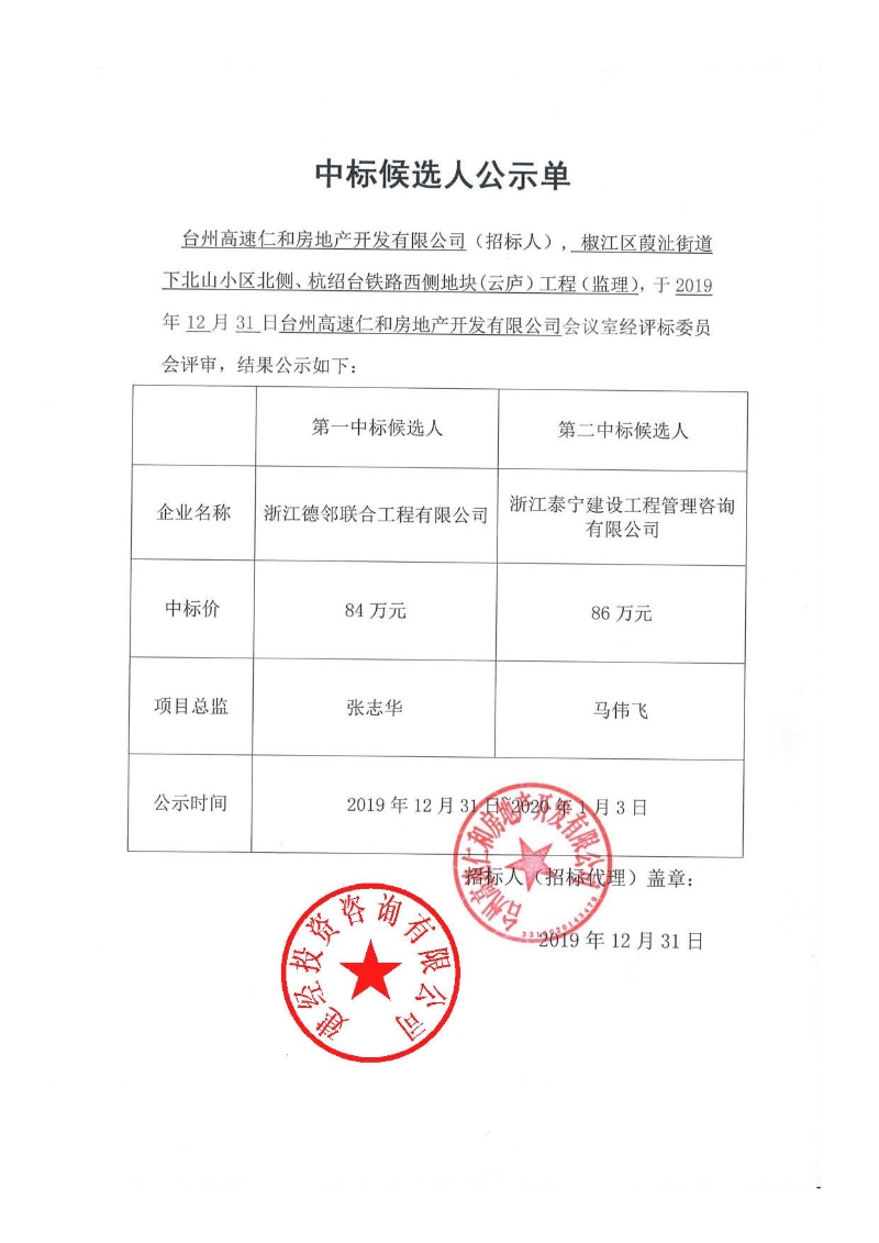 椒江區葭沚街道下北山小區北側、杭紹臺鐵路西側地塊(云廬)工程(監理)中標候選人公示單