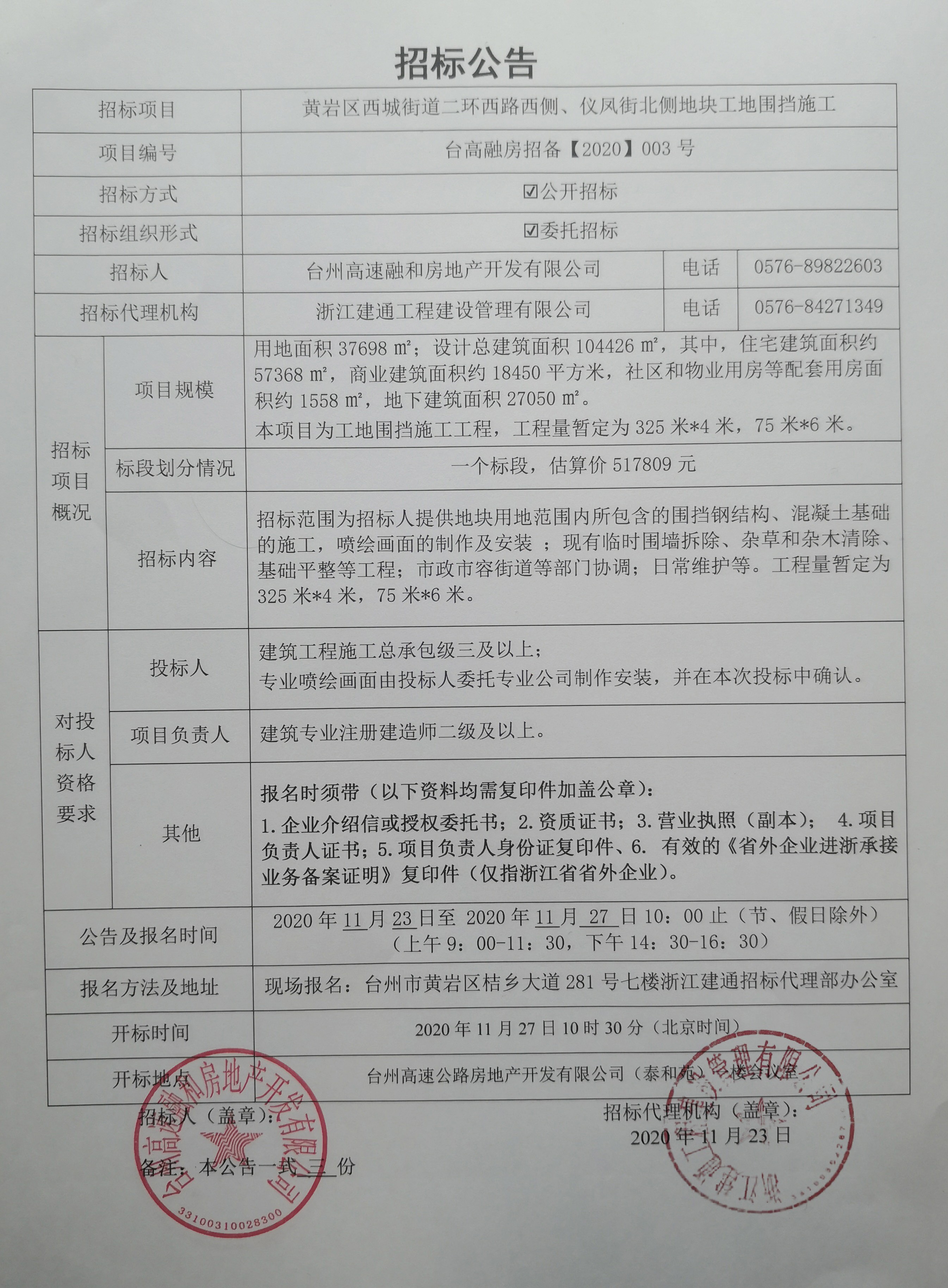 黃巖區(qū)西城街道二環(huán)西路西側(cè)、儀鳳街北側(cè)地塊工地圍擋施工招標公告