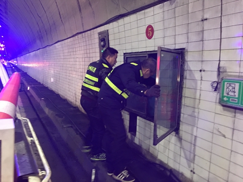 圖為工作人員檢查消防設(shè)備 冬日的隧道內(nèi)寒風(fēng)刺骨,執(zhí)勤隊員在轟鳴不止的噪音以及嗆人的汽車尾氣中,有條不紊地開始隧道清洗及設(shè)備檢修工作。一組人員站在登高車站臺上,檢修故障攝像機及燈具,擦拭隧道內(nèi)每個攝像機鏡頭、LED燈具。一組人員手持電筒,打開每一個消防設(shè)備箱,逐一檢查水帶、消防水龍頭、管道閥門等設(shè)施設(shè)備,仔細(xì)地排查各類安全隱患。 “再等2號故障攝像頭檢修清洗結(jié)束后回來。”已過下午1點鐘,黃土嶺隧道所副所長盧祖理還沒吃午飯,仍然埋頭于工作。