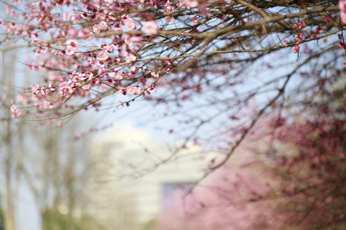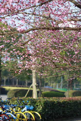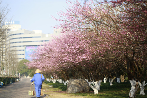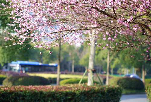 最后一站,便是市民廣場,我見過的最美公交站臺。初春的清晨啊,一下車便有沁香拂散,迎接我下車的那是大片繁花盛開呀,路邊草地一溜的紅梅、白梅,在藍天下絢爛地肆無忌憚地綻放。呵,是的,還有藍天,最近流行的一個詞叫“臺州藍”,忽然想起來,每日公交車上下班,低碳出行,這算是我為“臺州藍”添了一筆淡藍嗎?應(yīng)該是吧。于是,在藍天紅白花海中,慢慢穿過梅林、小橋、亭子,上班之路竟是如此心情舒緩。 鄭蔚
